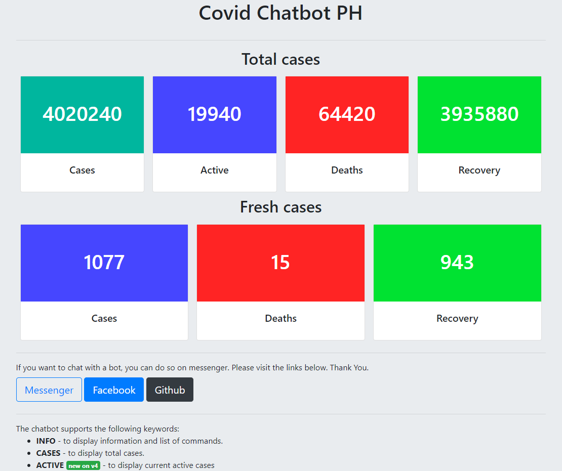 I later on made a simple update to the link on https://covid-chatbot-ph.herokuapp.com/ to display a simple details. I used the Bootstrap CSS for faster development.